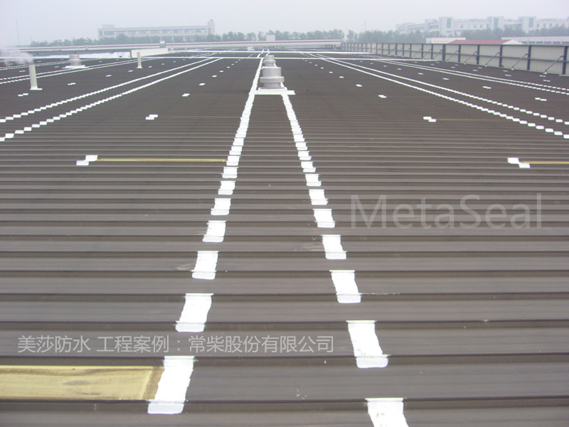 常柴股份公司多缸机厂房采用钢结构屋面,屋面面积约3万平方米,建成至今已有近7年时间。由于钢结构屋面跨度大,屋面板连接处的胶泥、硅胶等材料老化,局部钉子松动锈蚀,在竣工后5年左右时陆续出现多处漏水现象,已影响到工厂机器设备的正常运用及日常生产。为了解决这些问题,业主曾采用SBS沥青防水卷材对于漏水区域进行满铺维修,但效果很不理想,公司在咨询屋面专业人士后,决定采用MetaSeal美莎金属屋面防水体系,对于屋面上的各板搭接缝部位、屋脊、风机座、排烟(气)管部位、天沟等部位进行系统地防水维护,收到了良好的效果。